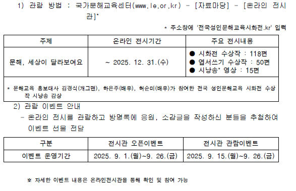 교육부와 국가평생교육진흥원에서는 문해교육 학습자의 학습성과 격려 및 문해교육의 사회적 인식 확산을 위해 2025년 9월을 '대한민국 문해의 달'로 선포하였습니다.