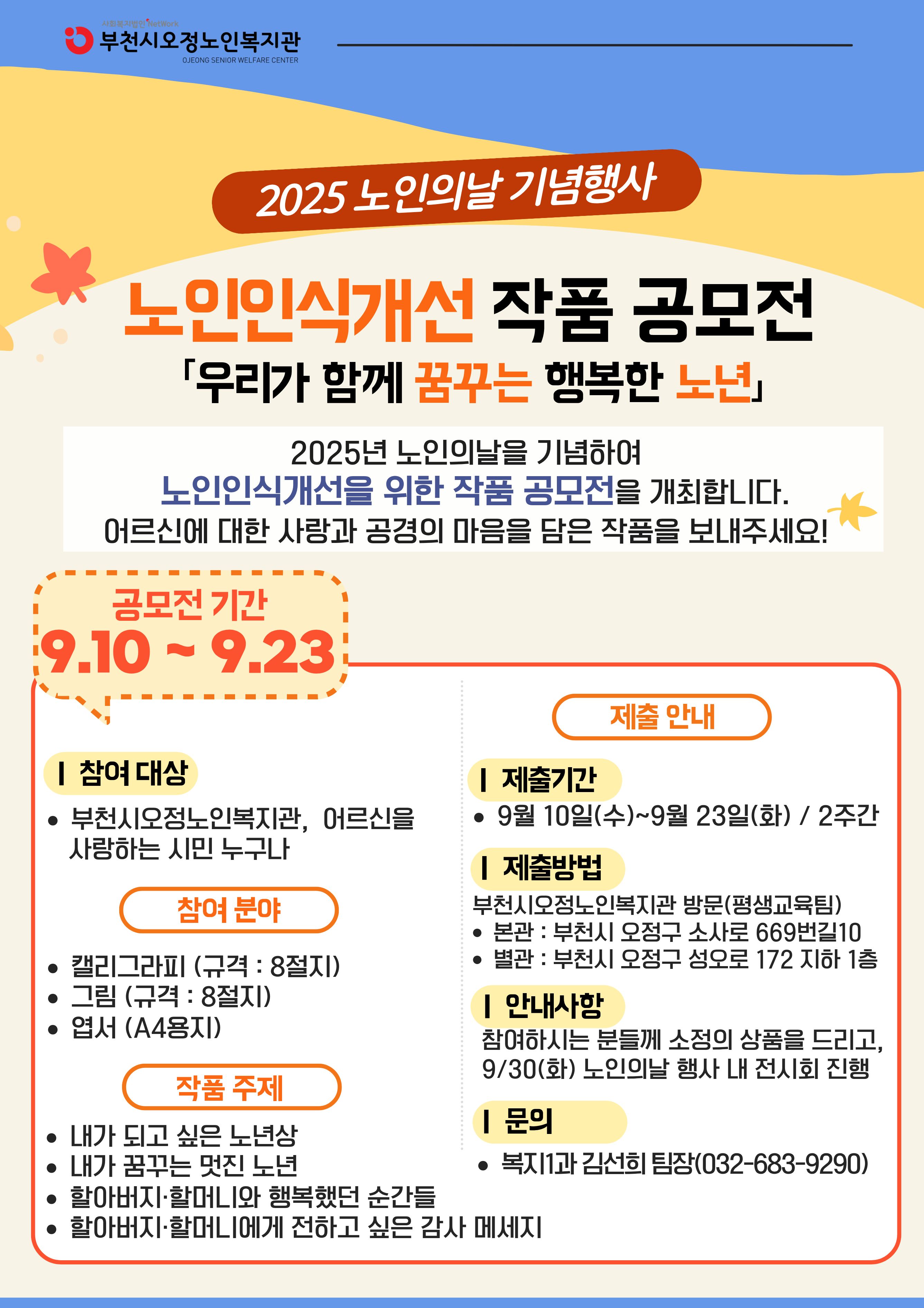 부천시오정노인복지관에서 2025년 노인의날 기념행사로 지역사회 내 어르신 공경 문화 확산을 위한 노인인식개선 작품 공모전을 아래와 같이 진행하오니, 적극적인 참여바랍니다.