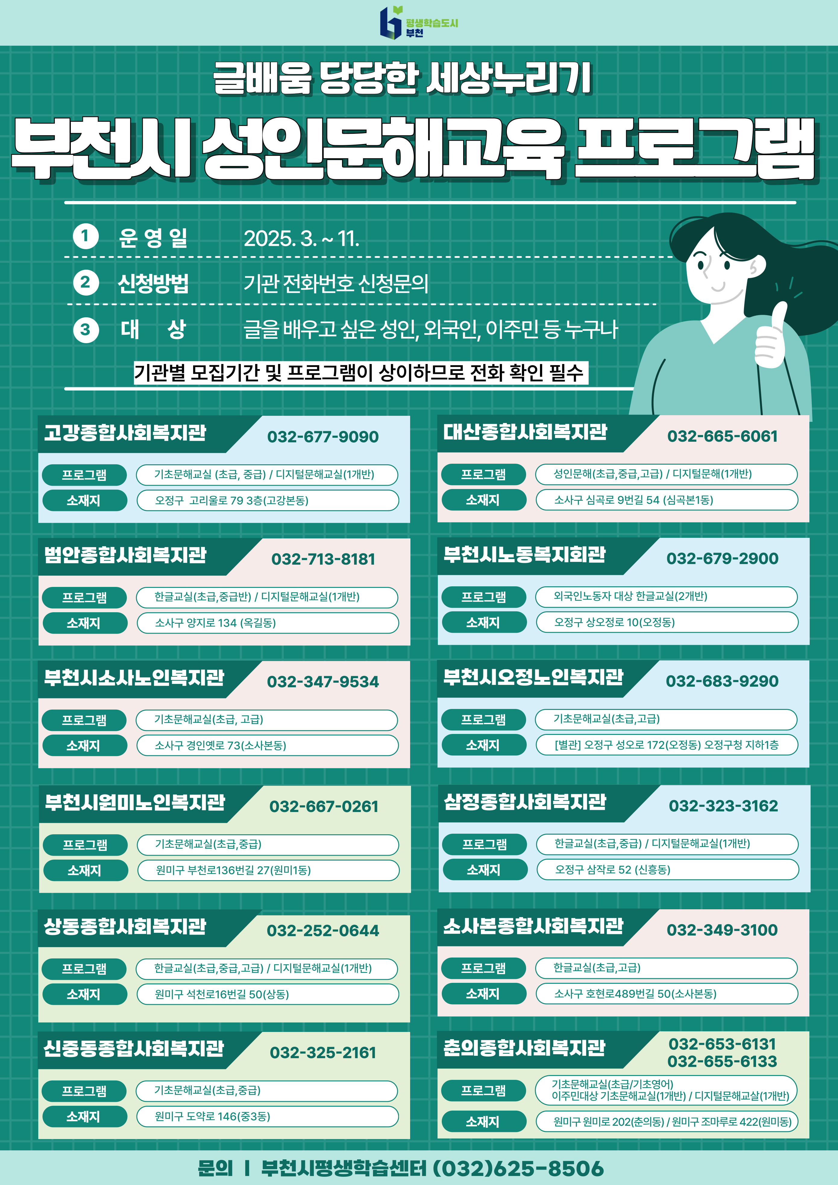 부천시 성인문해교육에 대한 자세한 정보와 교육 과정 참여 안내는 부천시평생학습센터(☎032-625-8506)로 문의하면 된다.