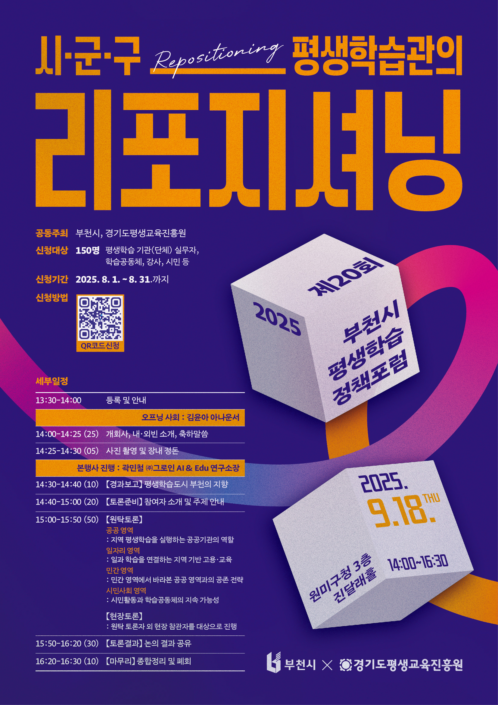 부천시는 9월 18일 오후 2시, 원미구청 진달래홀에서 ‘2025년 제20회 부천시 평생학습 정책 포럼’을 연다. 이번 포럼은 부천시와 경기도평생교육진흥원이 공동으로 주최하며, ‘시군구 평생학습관의 리포지셔닝(Re-positioning)’을 주제로 진행된다.